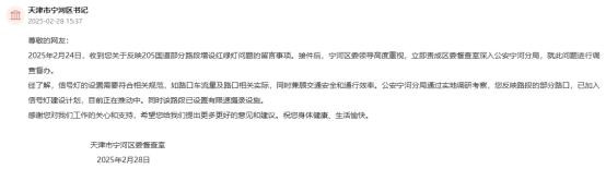 收到网友关于反映205国道部分路段增设红绿灯问题的留言事项,宁河区委领导立即责成区委督查室深入公安宁河分局,就此问题进行调查督办。